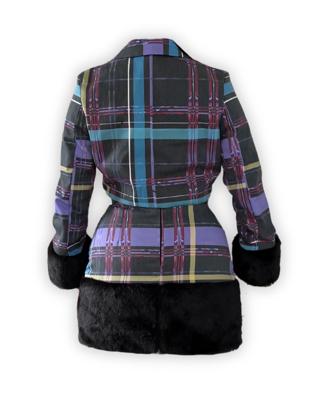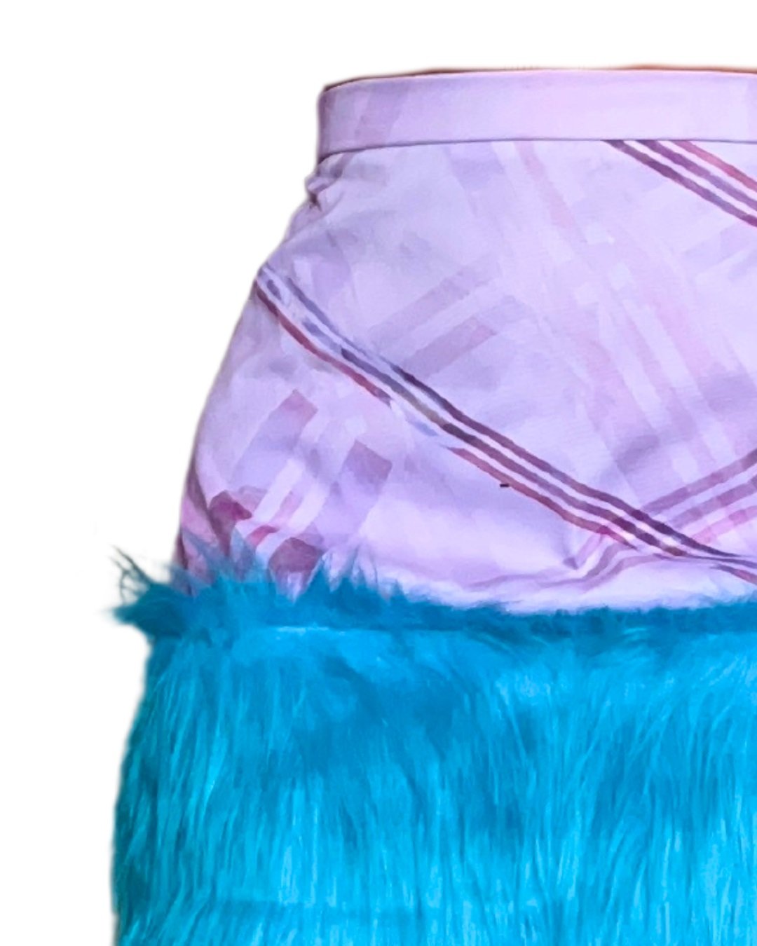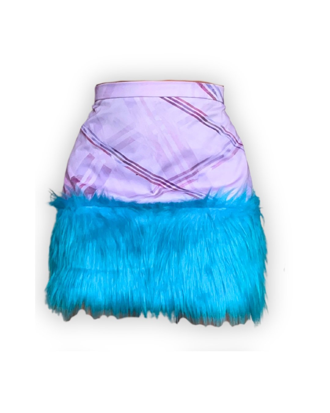 Falda mini con contorno de piel sintética, con tela rígida sublimada con pinturas en trama escocesa, con cierre invisible en la espalda