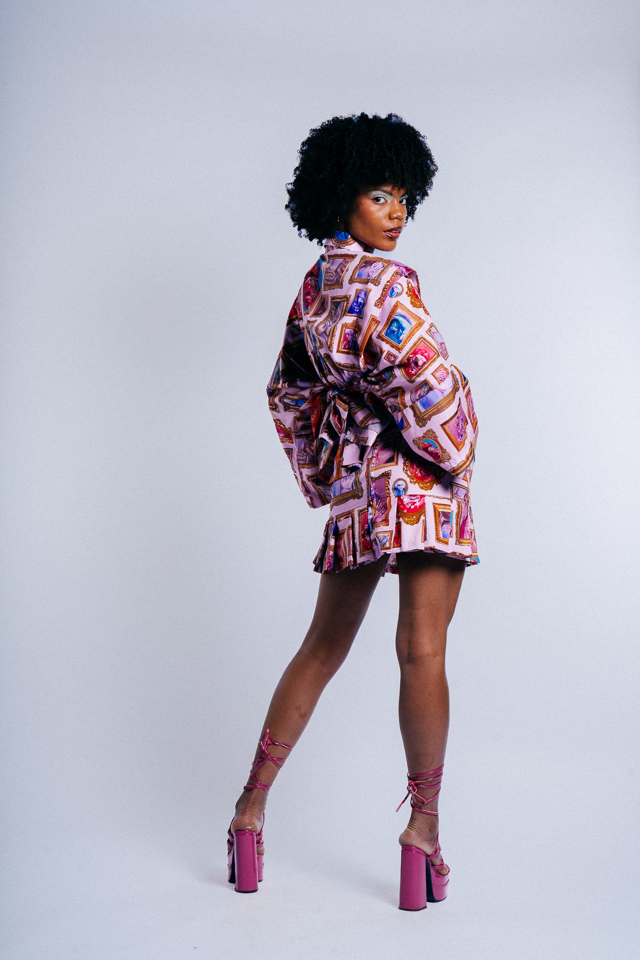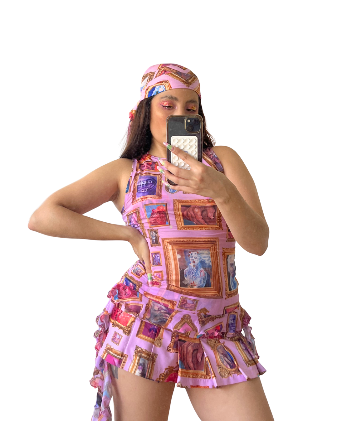 Falda Mini tableada con un estampado con las pinturas favoritas de Valeiva, pinturas hechas por la artista en óleo, que se digitalizaron para crear este patrón haciendo una galería de arte en una prenda.