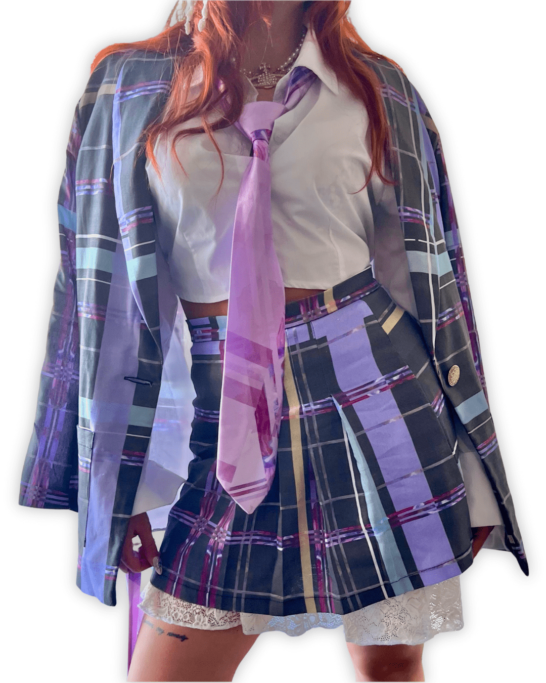 «Falda de telas sublimadas con pinturas originales de Valeiva, en trama escocesa.