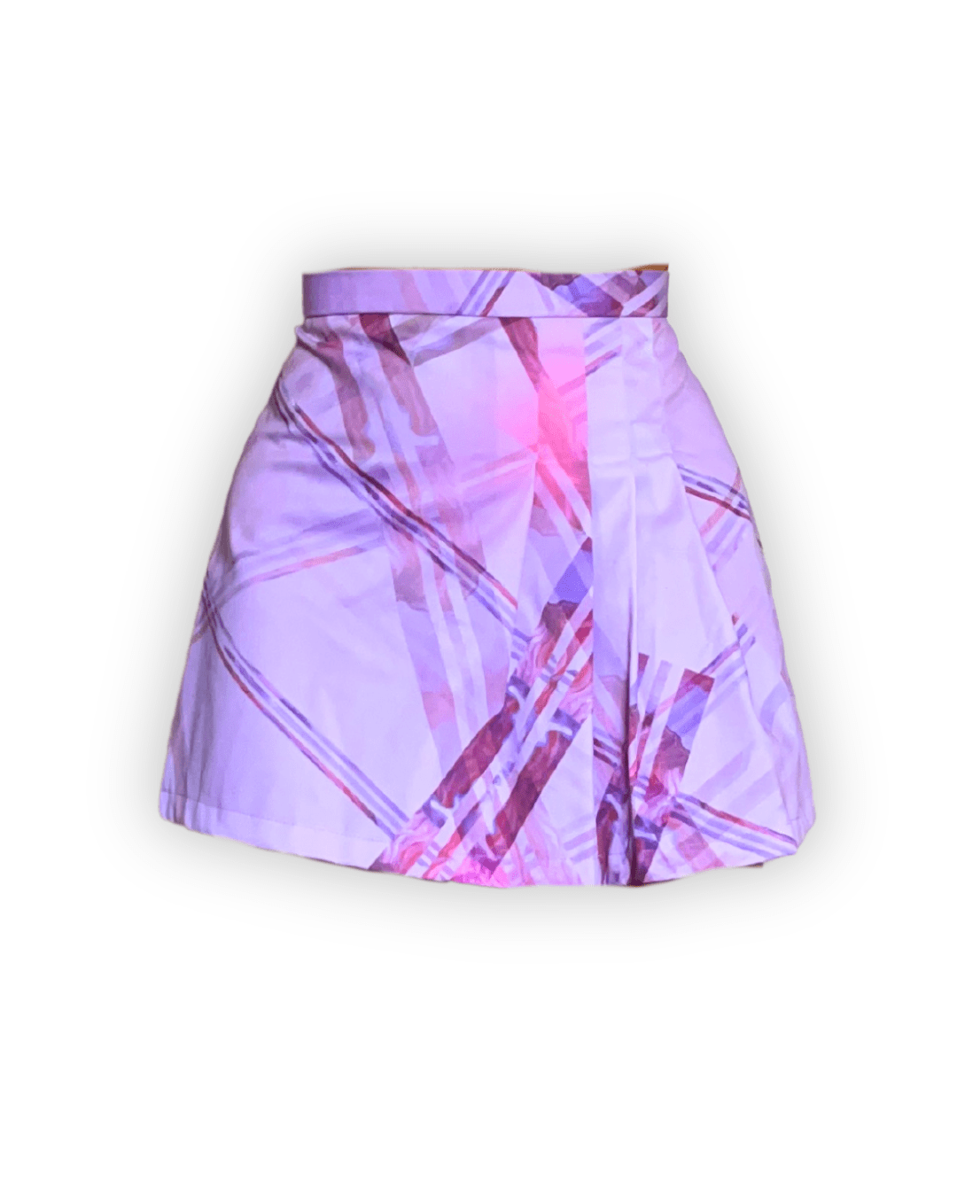 Falda de tela satinada sublimada con pinturas, con tablas delanteras y cierre invisible en la espalda