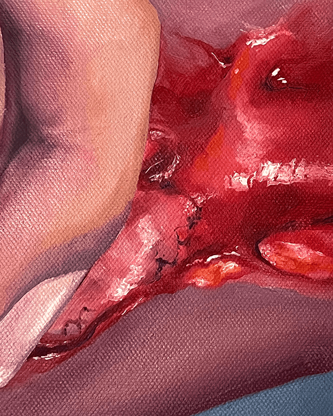 Pintura al óleo sobre bastidor, con la temática de figura humana, un zoom a la zona de la rodilla con lo expuesto del órgano interno, representando la somatización de emociones.
