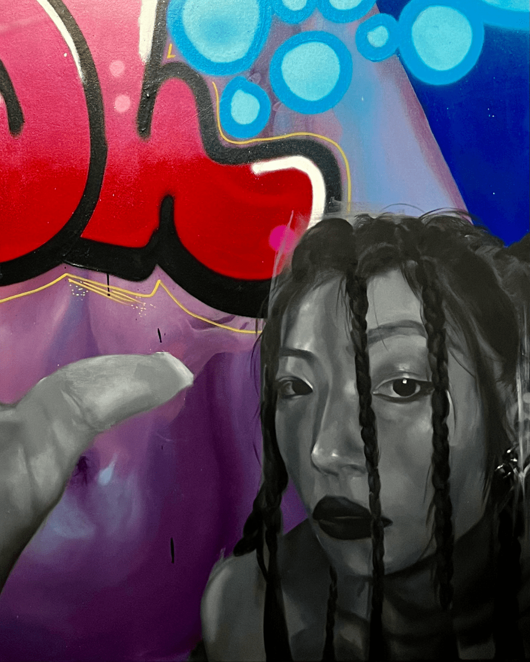 Pintura de técnica mixta, con óleo y spray sobre bastidor, con temática de figura humana y grafiti.