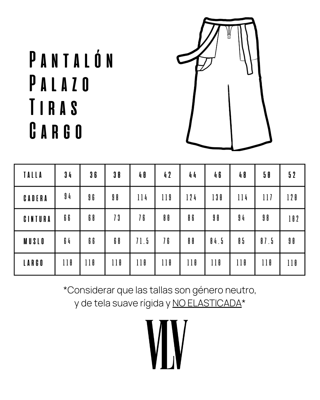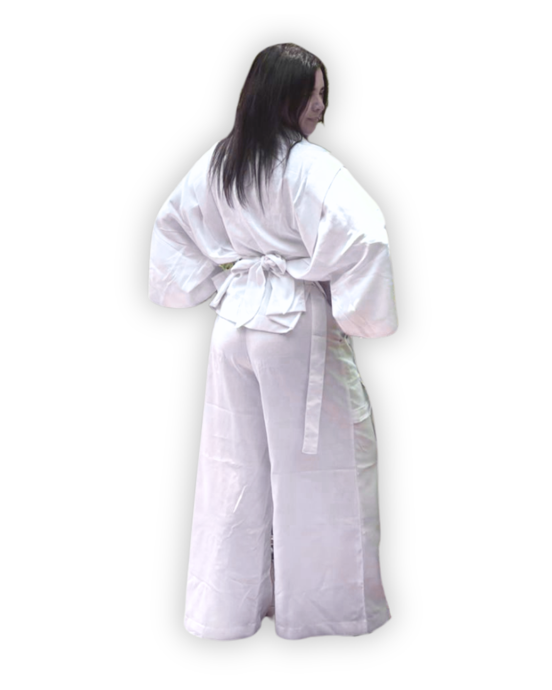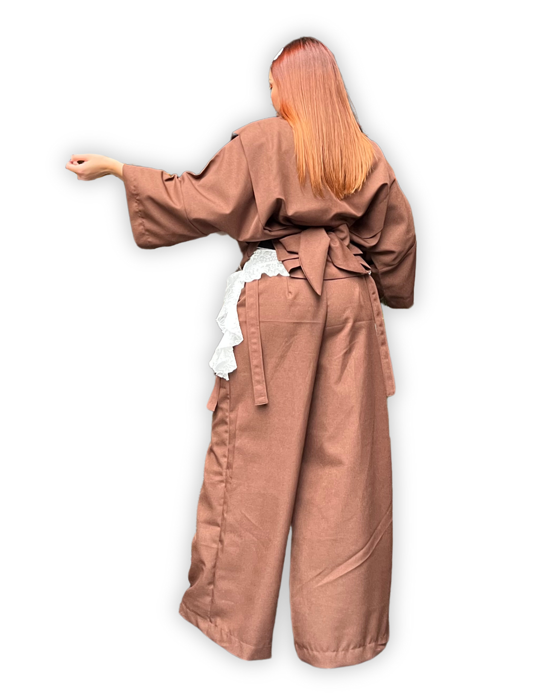 «Pantalón estilo cargo, corte palazo ancho, con telas de saldo nacional. Posee 2 bolsillos y amarras sueltas que le otorgan el estilo cargo y además combinan con la camisa Kimono. Posee cierre delantero y botón.»