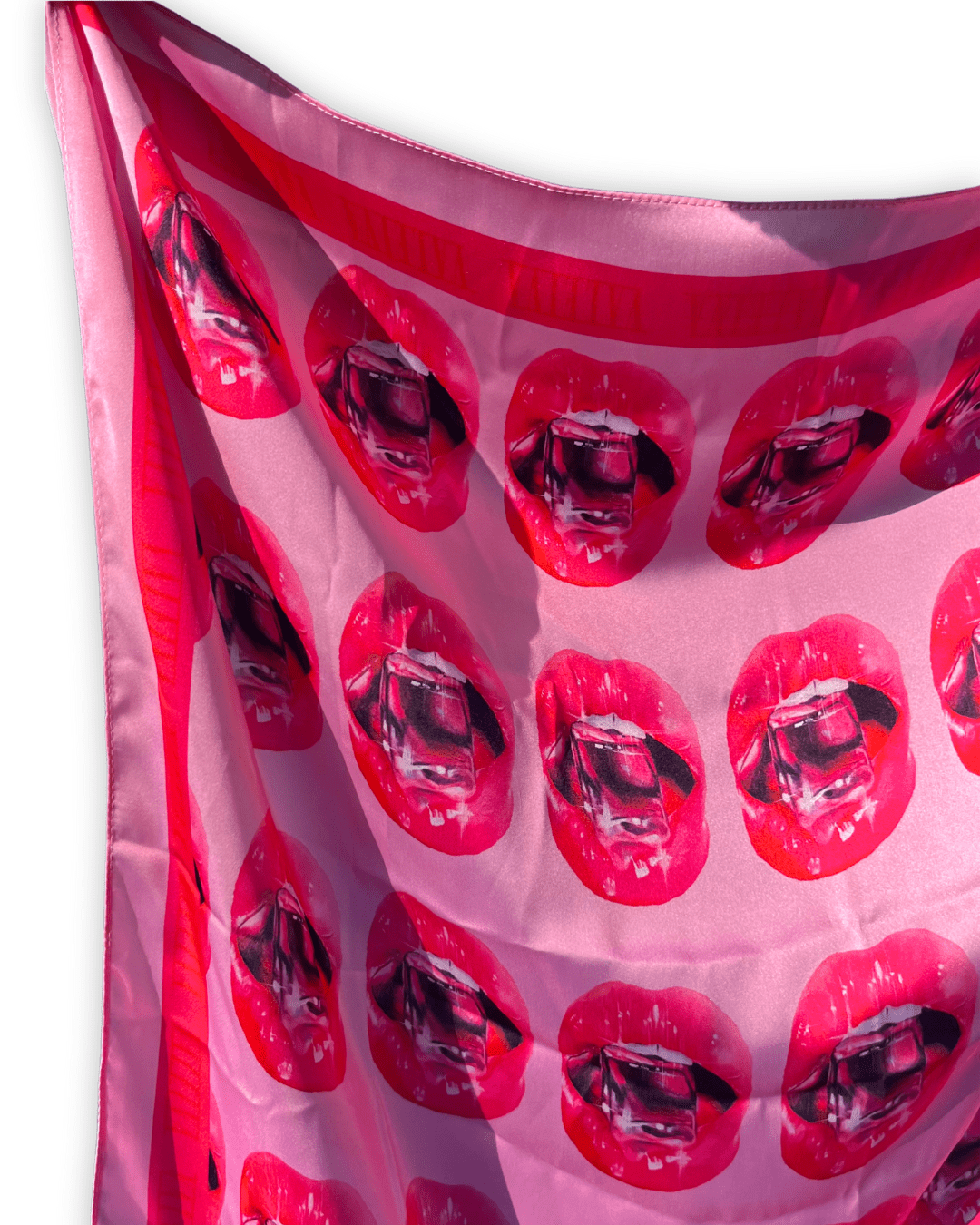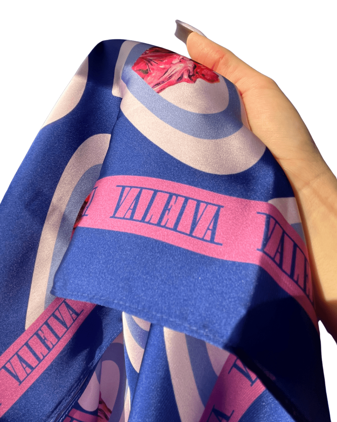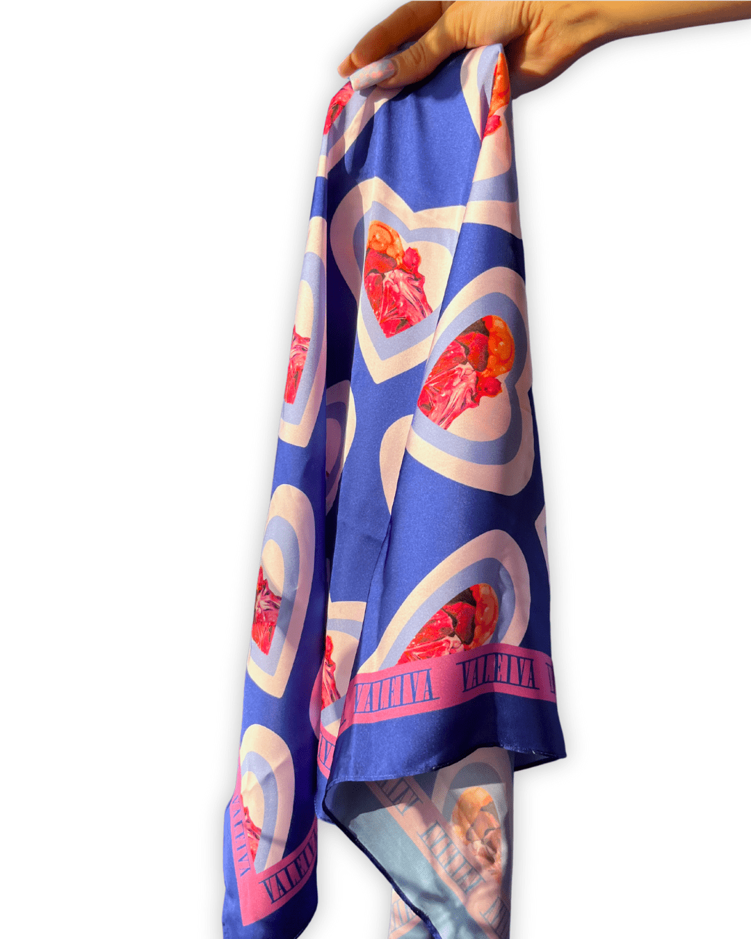 «Pañuelo de de 50×70 cm, de la colección retro futuro, donde existen dos tipos de telas creadas con pinturas al óleo digitalizadas, hechas patrones para telas. Estos dos modelos se crearon con técnica de sublimación, para un acabado brillante resistente a lavados y el sol.»