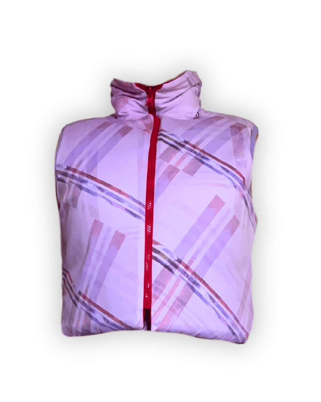 Puffer sin mangas reversible de latex rojo por un lado y por el otro tela sublimada, con cierre reversible